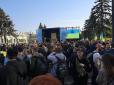 Організатори акції зі сцени попрохали активістів прибрати партійні прапори, і залишити лише державні. Учасники зібрання тримають у руках плакати зі словами "Мова - це зброя", "Бути українцем = голосувати за закон про державну мову", "Захистіть мову - г...